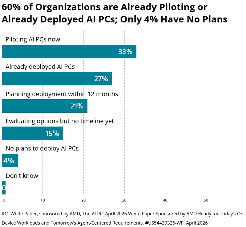 Efekty wdrożeń są mierzalne i widoczne w codziennych operacjach. 70 proc. przedsiębiorstw odnotowało wyraźny wzrost wydajności, a 66 proc. poprawę ogólnej produktywności po zainwestowaniu w infrastrukturę wspierającą AI. Obecnie 67 proc. podmiotów zwiększa wykorzystanie tych technologii, a 61 proc. wbudowuje je bezpośrednio w standardowe procesy operacyjne. IDC prognozuje, że do 2028 roku urządzenia AI PC będą stanowić niemal 94 proc. wszystkich dostaw na rynek komercyjny, co wiąże się również z koniecznością przejścia na system Windows 11 przed zakończeniem wsparcia starszych wersji oprogramowania.