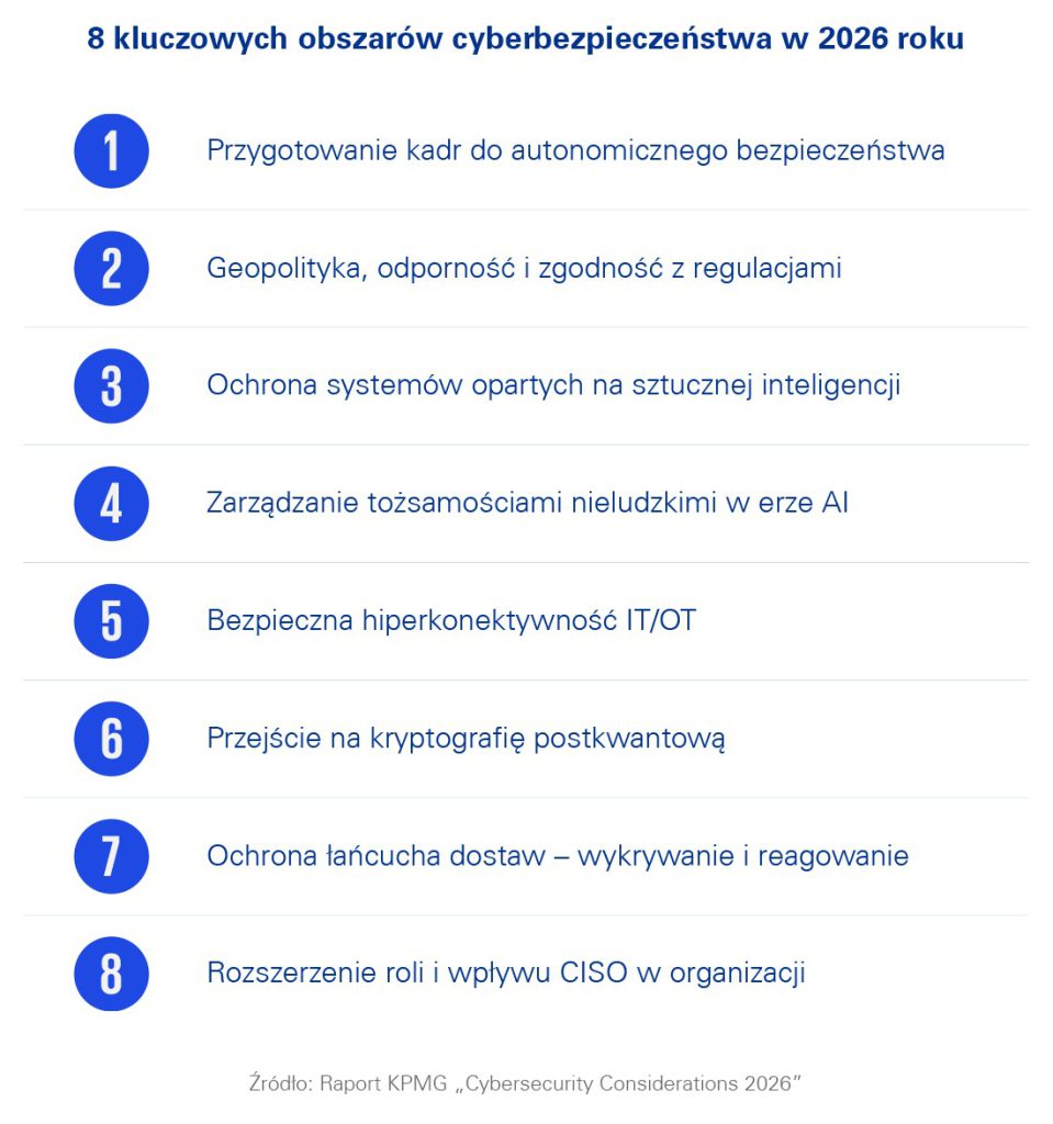 Raport KPMG identyfikuje obszary wymagające szczególnej uwagi zarządów. Należą do nich m.in. ochrona systemów sztucznej inteligencji jako element budowania zaufania i zgodności regulacyjnej oraz zarządzanie tożsamościami nieludzkimi, których liczba dynamicznie rośnie i wymyka się tradycyjnym modelom kontroli.