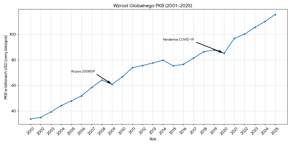 33,62 bln USD – tyle wynosiło, jak wynika z danych Banku Światowego, globalne PKB w 2001 roku. Prognoza IMF World Economic Outlook Database z października 2025 roku dla 2025 zakładała, że globalne PKB wynosi około 115,6 bln USD. Tak, w czasie niemal nieustających kryzysów zanotowaliśmy, jako ludzkość, wzrost zamożności. Muszę też dodać, że jest to wartość pozorna, bo, chociaż wyrażona w tej samej walucie, to nie uwzględniająca zmieniającej się siły nabywczej dolara. Nie ma jednak wątpliwości, że nawet uwzględniając ów wzrost – ludzkość generuje większe PKB niż w 2001 roku.