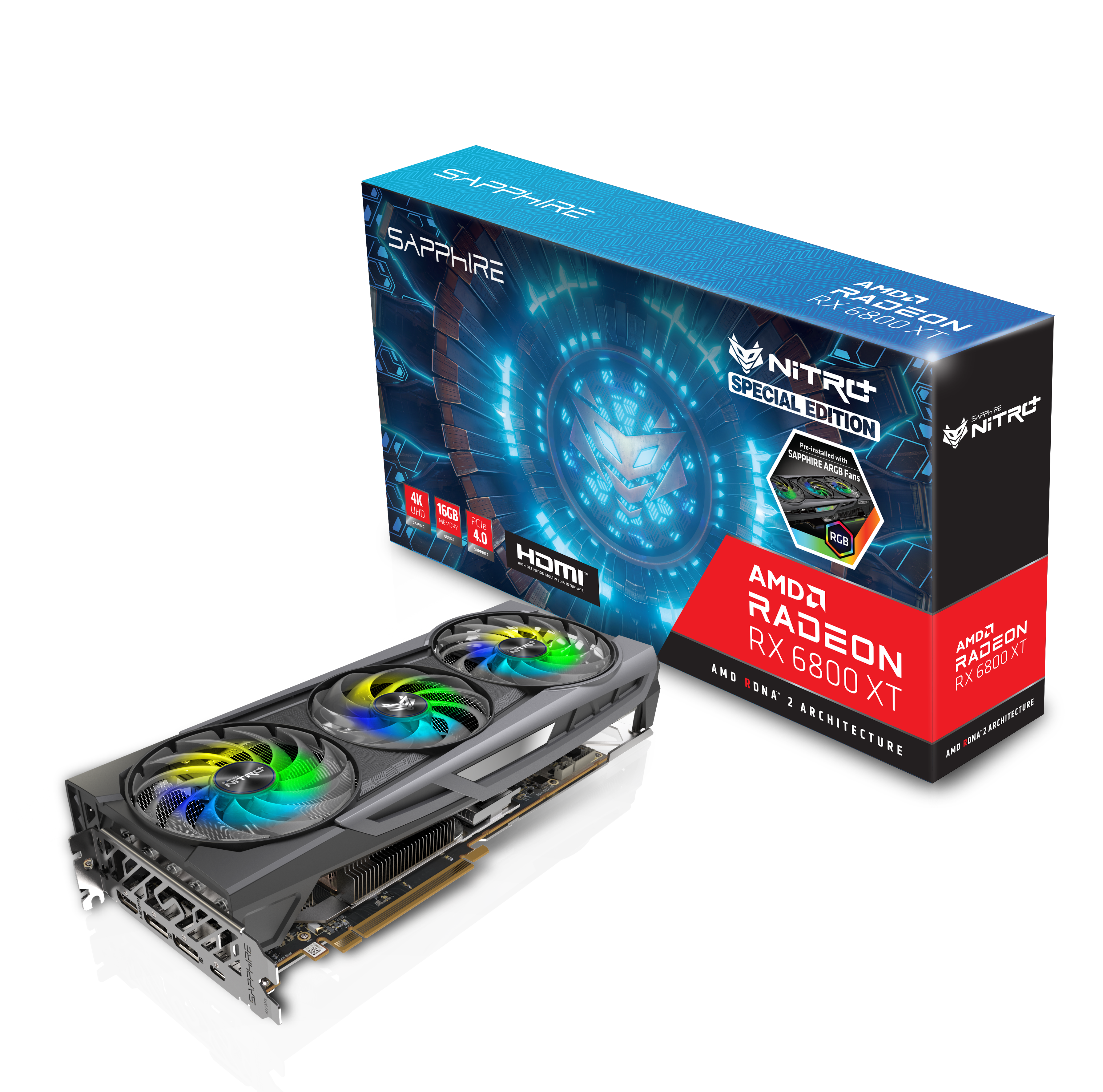 Backplate oraz górny pasek wzdłuż laminatu kart NITRO+ z serii RX 6800 otrzymały podświetlenie ARGB. Za pomocą programu SAPPHIRE TriXX użytkownik może ustawić wiele trybów pracy podświetlenia. Jedne z dostępnych opcji to przypisanie różnych kolorów do przedziałów temperatur, z jakimi pracuje rdzeń graficzny, czy też zmiana koloru w zależności od trybu pracy wentylatorów. Przy pomocy 3-pinowego złącza na laminacie karty iluminację można również zsynchronizować z diodami LED płyty głównej.