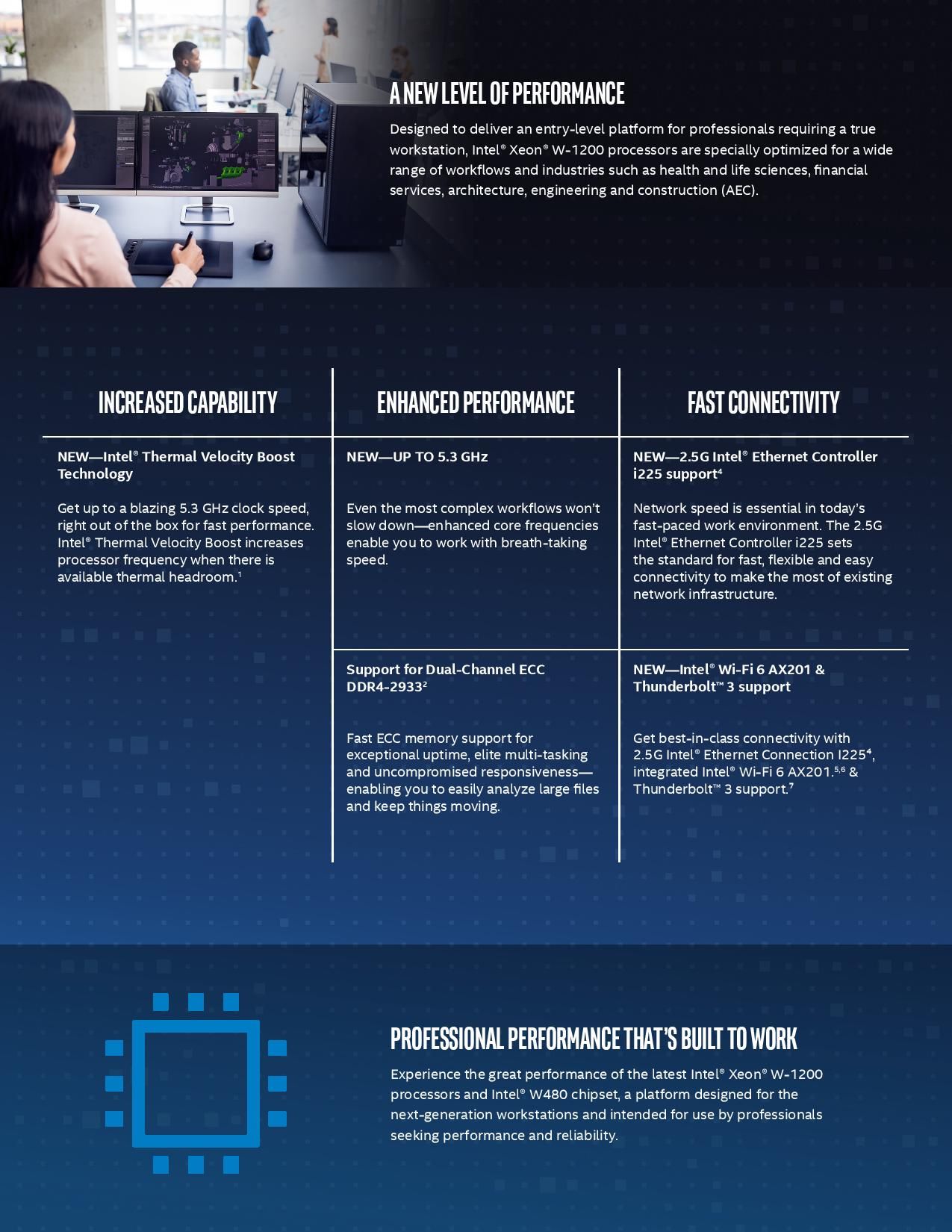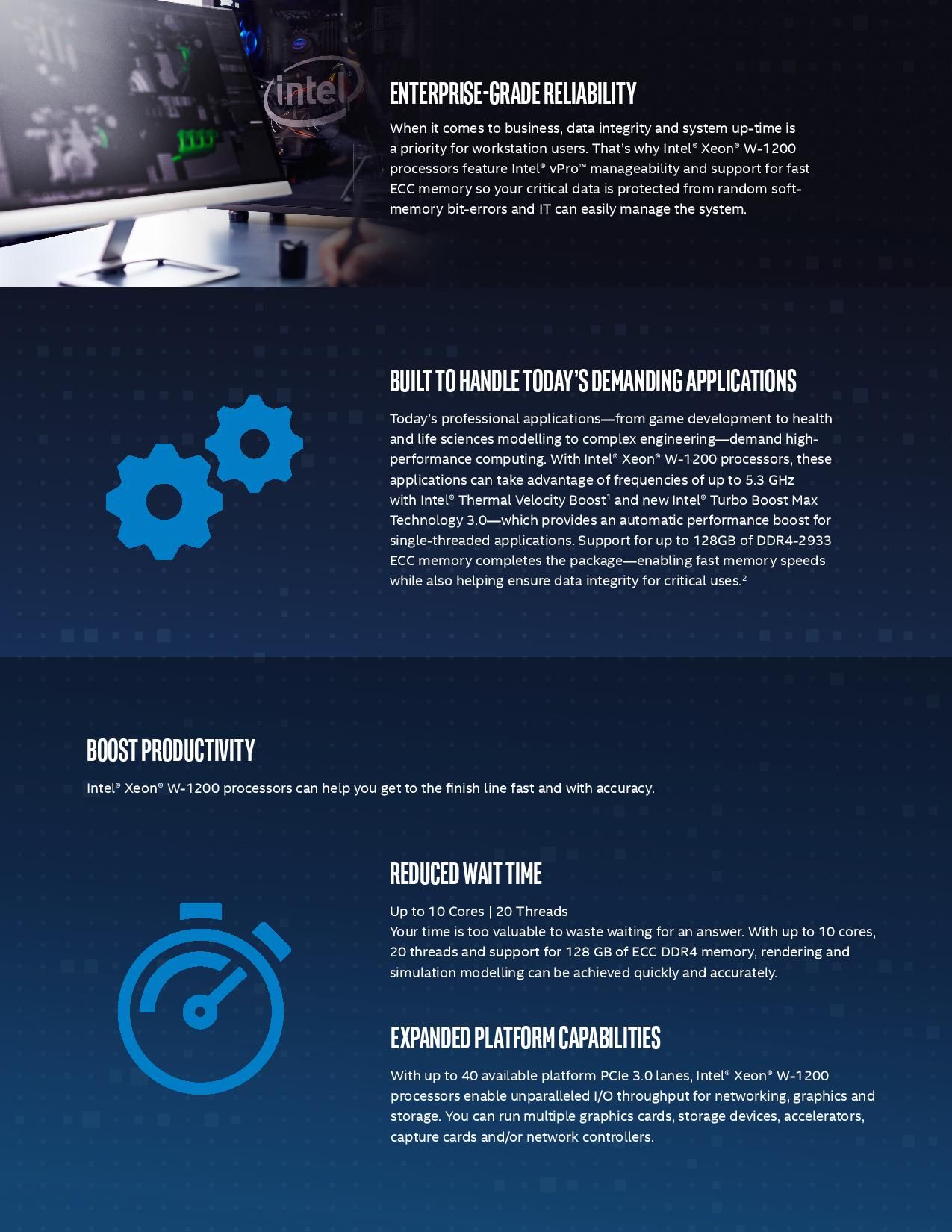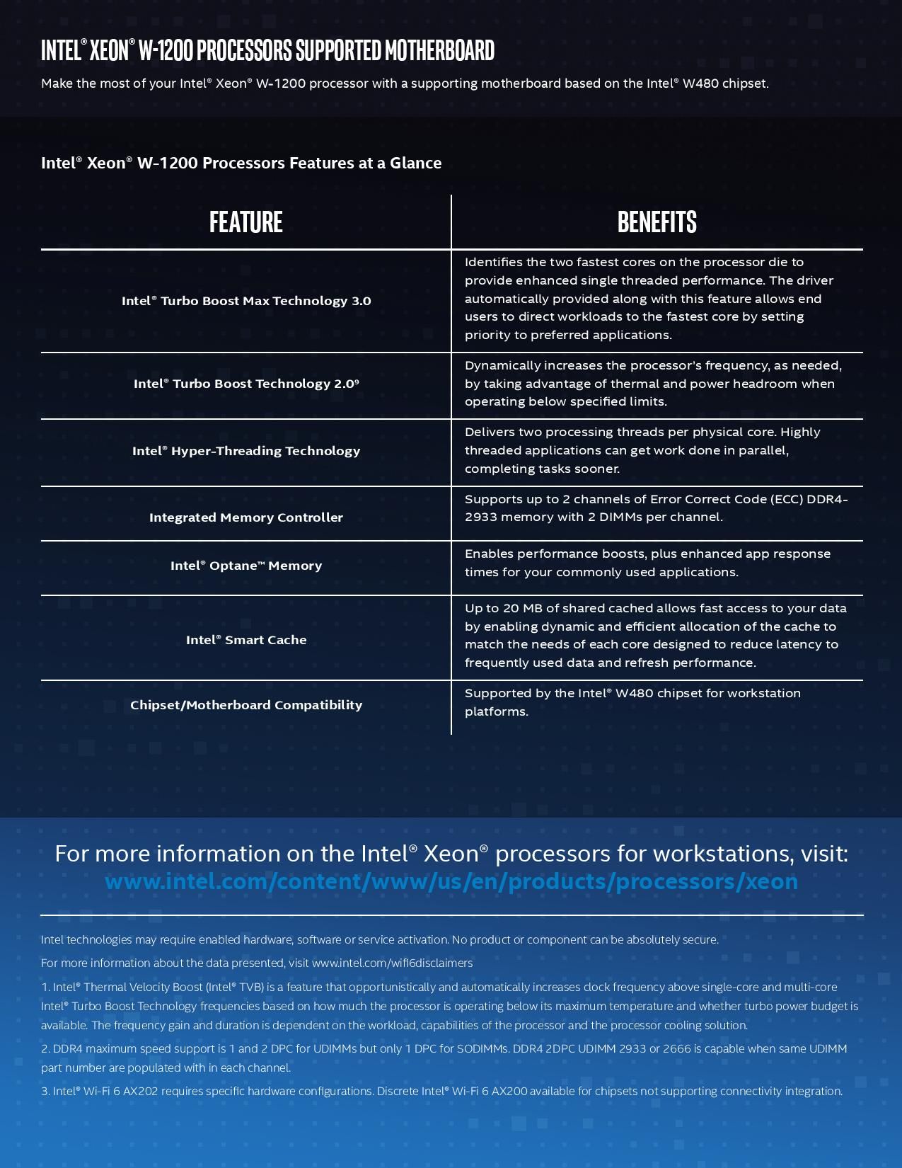Nowa linia procesorów z serii Xeon W-1200 wykorzystuje gniazdo LGA1200, podobnie jak nowa seria procesorów Core 10. generacji, ale są przeznaczone do stacji roboczych z chipsetami W480. Intel opiera swoje nowe Xeony na tej samej architekturze Comet Lake znanej z ostatnio wprowadzonych na rynek procesorów Core 10 generacji.