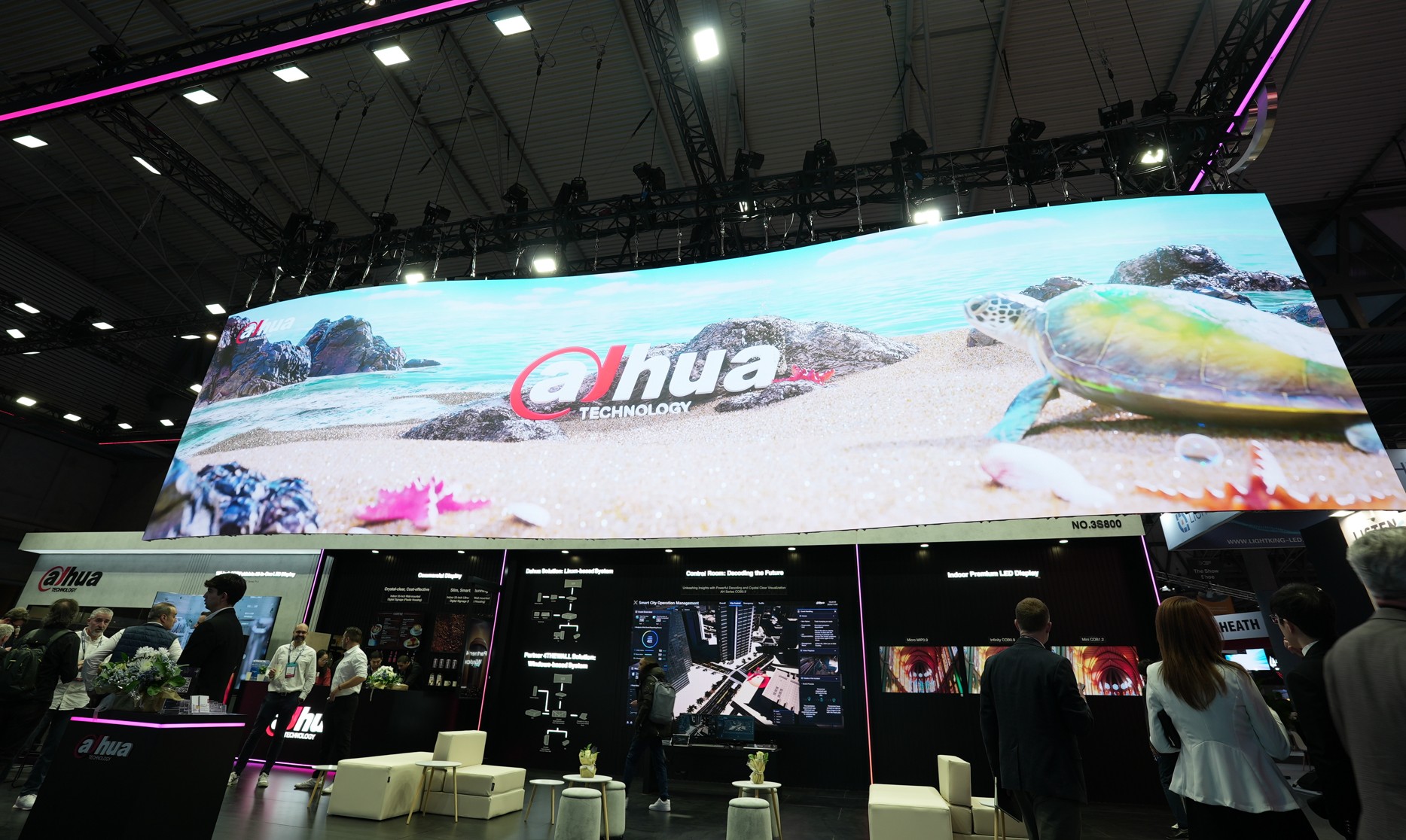 Na ISE 2026 Dahua zaprezentowała panele SM‑series oparte na technologii MiP (MicroLED in Package), przeznaczone do wymagających instalacji typu indoor. W porównaniu z klasycznymi COB‑ami moduły MiP oferują wyższy kontrast do 100 000:1, głębszą czerń i drobniejsze szczegóły obrazu przy małych pitchach, przy kątach widzenia powyżej 170 stopni. Technologia MiP z monolitycznymi modułami MicroLED i masowym transferem zapewnia miniaturyzację, stabilność mechaniczną i wysoką trwałość ekranów. Rozwiązanie celuje w segment premium: korporacyjne lobby, sale zarządów oraz studia broadcastingowe.