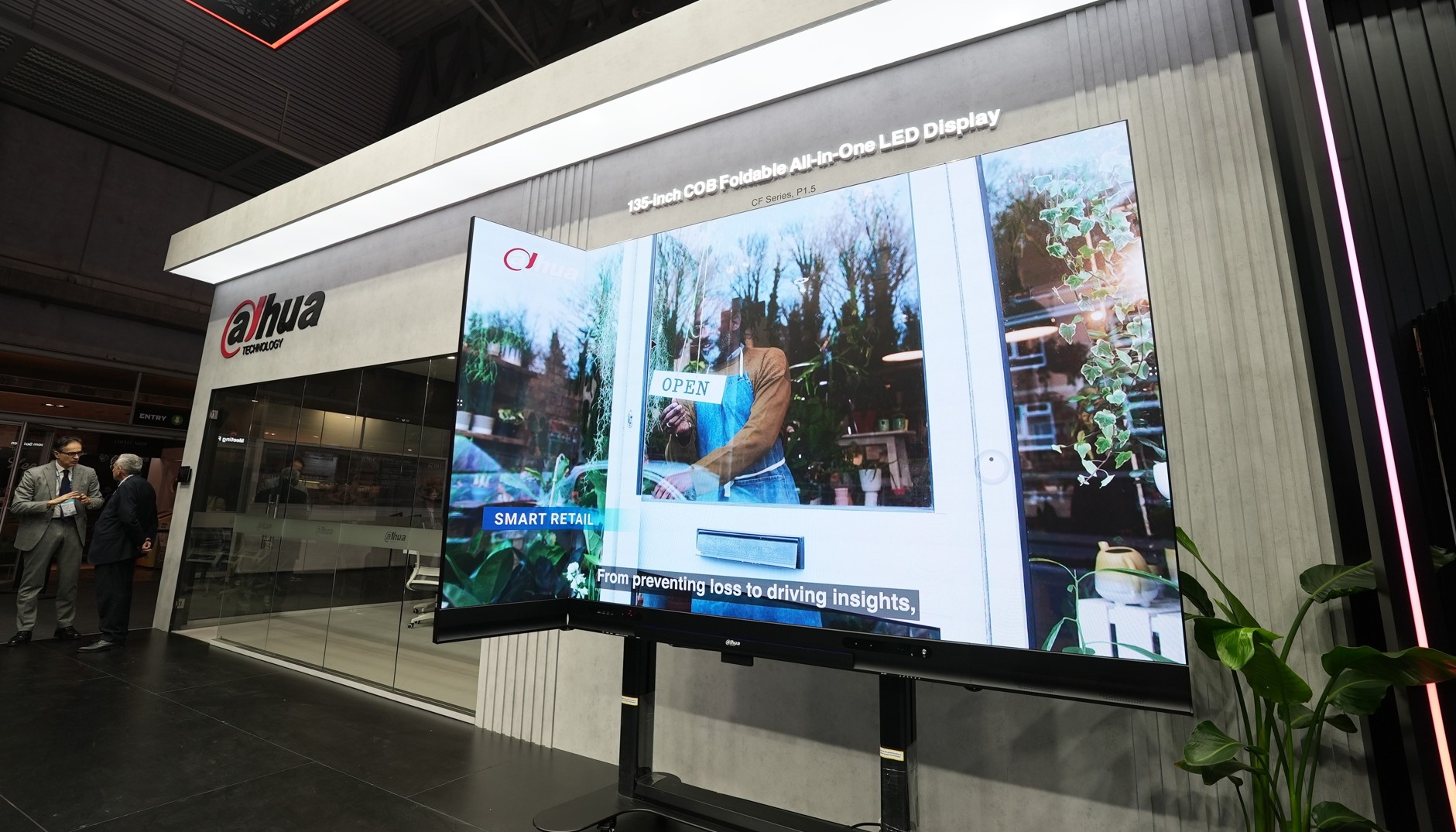 Dahua pokazała też panele SE‑series z pakietowaniem SMD, nastawione na elastyczność w handlu i przestrzeniach komercyjnych. Ekrany o różnych rozdzielczościach i rozmiarach można łączyć w niestandardowe kształty z obrotem modułów o 90 stopni bez zmiany kolorystyki; modele witrynowe mają grubość 28 mm. Zakrzywione moduły rentalowe wykorzystują blokady łukowe do tworzenia ekranów płaskich, wypukłych i wklęsłych z regulacją kąta co 2,5 stopnia w zakresie −10° do +10°. Wariant Cube umożliwia budowę brył 90° i wielostronnych „kostek” do eventów z łatwym serwisem hot‑swap.