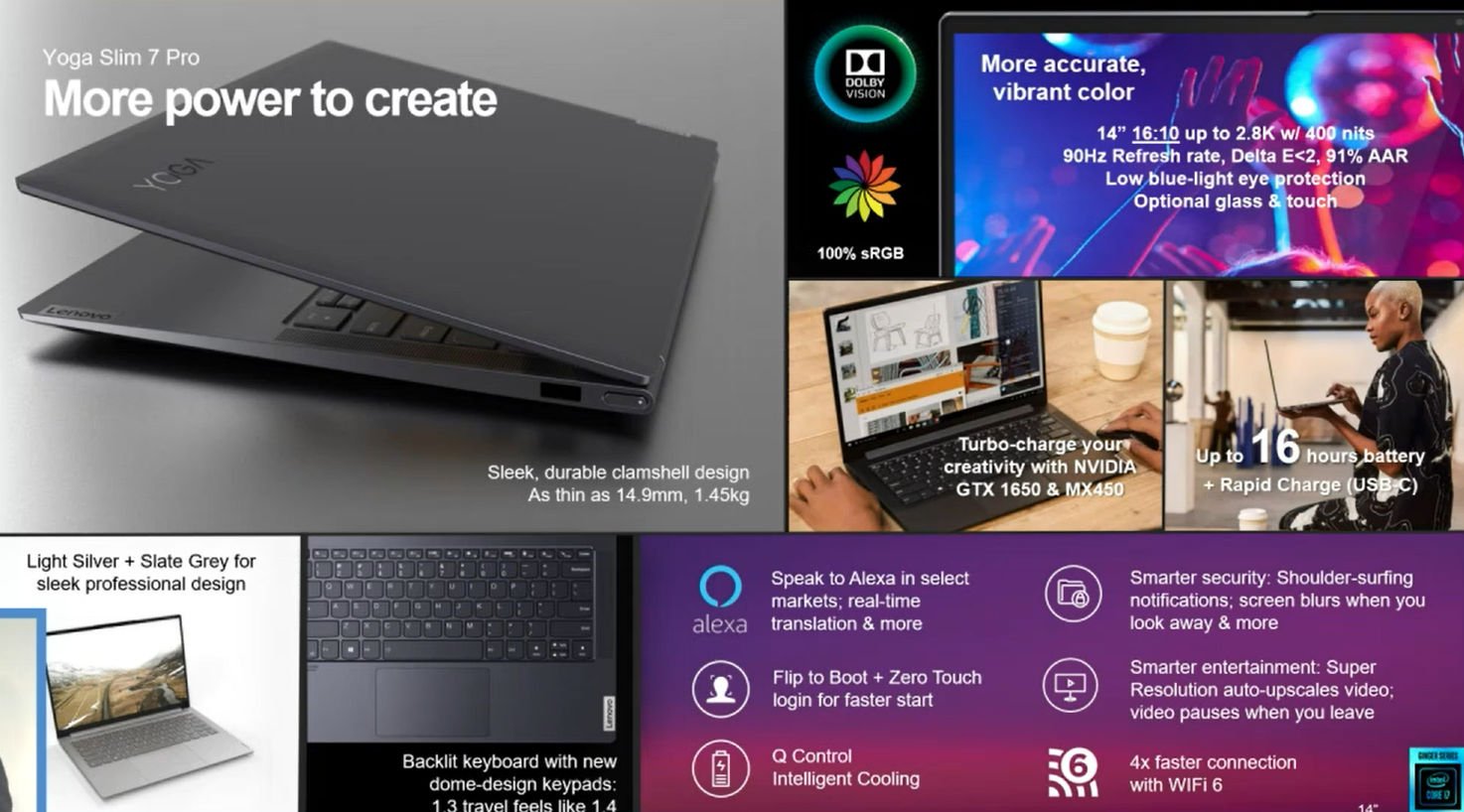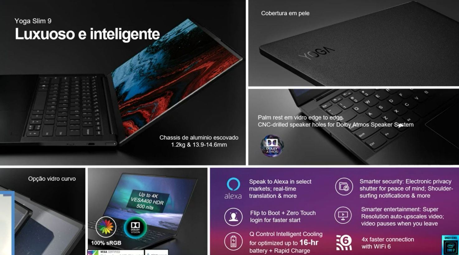 Seria Lenovo Yoga 9 będzie zawierać dwa warianty 15,6-calowe i jeden 14-calowy. Zarówno Lenovo Yoga 9, jak i Yoga Slim 9 to 15,6-calowe warianty z panelami 4K, z certyfikatem VESA HDR 400 i obsługą Dolby Vision. Laptopy mają również używać procesorów Intel Tiger Lake Core i7, ale nie wiadomo, który konkretny wariant to Lenovo będzie im oferować.