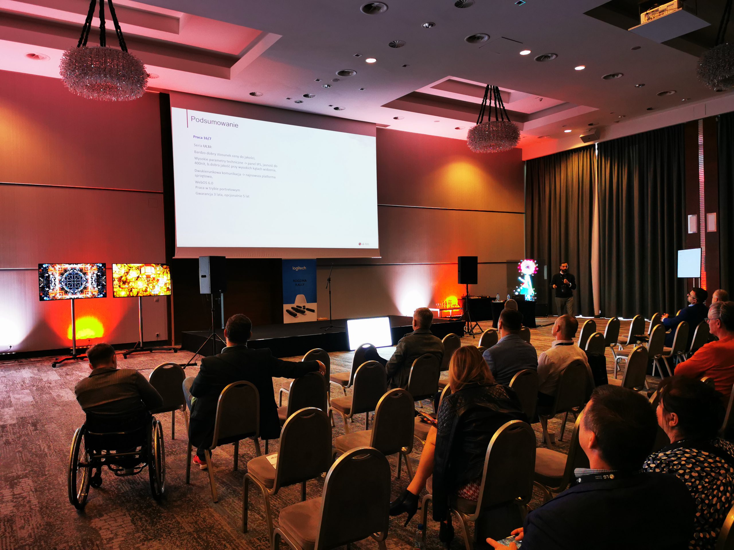 Prezentacje skupiały się nie tylko na produktach LG, ale na rozwiązaniach partnerów firmy. Przede wszystkim mówiono o produktach, które mają znaczenie dla instalatorów pracujących z ekranami LG. Maciej Jarosz z firmy Edbak opowiadał o produkowanych przez tę firmę systemach instalacyjnych i montażowych dla ekranów… właściwie dowolnego formatu. Od niewielkich (np. stosowanych w gabinetach medycznych) aż po olbrzymie ekrany outdoorowe. Dużo było mówione także o nagłośnieniu, naturalnym uzupełnieniu ekranów LG. O sprzęcie audio mówili m.in. Jacek Stanisławski, CEO Phono Media (dając świetną prezentację o głośnikach Martin Audio) i – Tomasz Junker, Projektant Systemów AV Phono Media (mówiący o wzmacniaczach i rozwiązaniach do bezprzewodowej transmisji audio marki Ecler). Ponieważ świat pracy zdalnej i spotkań online pozostanie ważną częścią otoczenia biznesowego, nie mogło zabraknąć prezentacji z tego zakresu.