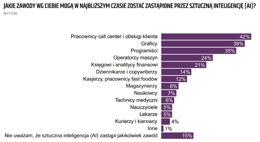 Polacy widzą w sztucznej inteligencji pomoc w pracy, ale 15% spodziewa się masowej utraty miejsc pracy. Najbardziej zagrożone zawody to pracownicy call center, graficy i programiści.