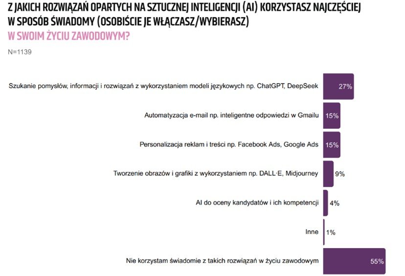 Ci, którzy już wykorzystują AI, najczęściej szukają pomysłów i inspiracji za pomocą modeli językowych. Dotyczy to szczególnie pokolenia Z, gdzie odsetek sięga 62%. Główne zalety AI w pracy to automatyzacja rutynowych zadań (40%) i szybsze podejmowanie decyzji (30%). Mimo pozytywnych aspektów, 15% badanych spodziewa się masowej utraty miejsc pracy w związku z rozwojem AI.