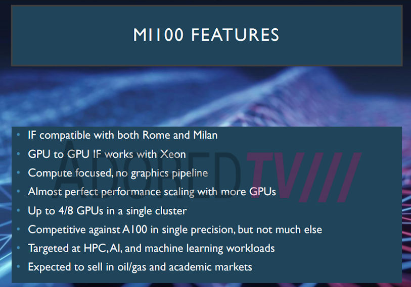 Według ujawnionych slajdów, MI100 jest o ponad 100% szybszy niż NVIDIA A100 w obciążeniach FP32, oferując prawie 42 TFLOP mocy obliczeniowej w porównaniu do 19,5 TFLOP z A100. Poprzednie przecieki również twierdziły, że TDP jest ustawione na 200 W, ale ostatni wyciek pokazuje 300 W, co oznacza, że taktowanie rdzeni zostało wyraźnie podniesione. W tym przypadku MI100 ma 7680 rdzeni pracujących z częstotliwością 2,75 GHz lub 15360 rdzeni pracujących z częstotliwością ~ 1,37 GHz. Ta ostatnia konfiguracja byłaby bardziej prawdopodobna, sądząc po niższych zegarach, ale liczba rdzeni wydaje się zbyt duża.