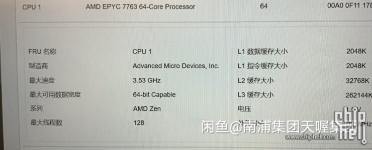 Grafiki prezentowane poniżej pochodzą z forum serwisu Chiphell. Na pierwszej przedstawiono procesor serwerowy AMD 3. generacji EPYC Milan oznaczony jako EPYC 7763. To co widzimy, wydaje się być wczesną próbką inżynieryjną nowej generacji procesorów serwerowych. Ma to być 64-rdzeniowy procesor wykonany w 7 nm i zgodny z architekturą Zen 3. Taktowanie podstawowe ma wynosić 2,45 GHz. Boost to 3,5 GHz, chociaż należy założyć, że parametry jeszcze ulegną zmianie. W badanym komputerze pracowały dwa takie procesory, więc patrzymy na łącznie 128 rdzeni i 256 wątków. Każdy układ zawierał 32 MB pamięci podręcznej L2 i 256 MB pamięci podręcznej L3. CPU zostanie skonfigurowany z 280W TDP. Chip ma kod OPN „100-000000312”. Wygląda na to, że EPYC 7763 jest wciąż wczesnym samplem.