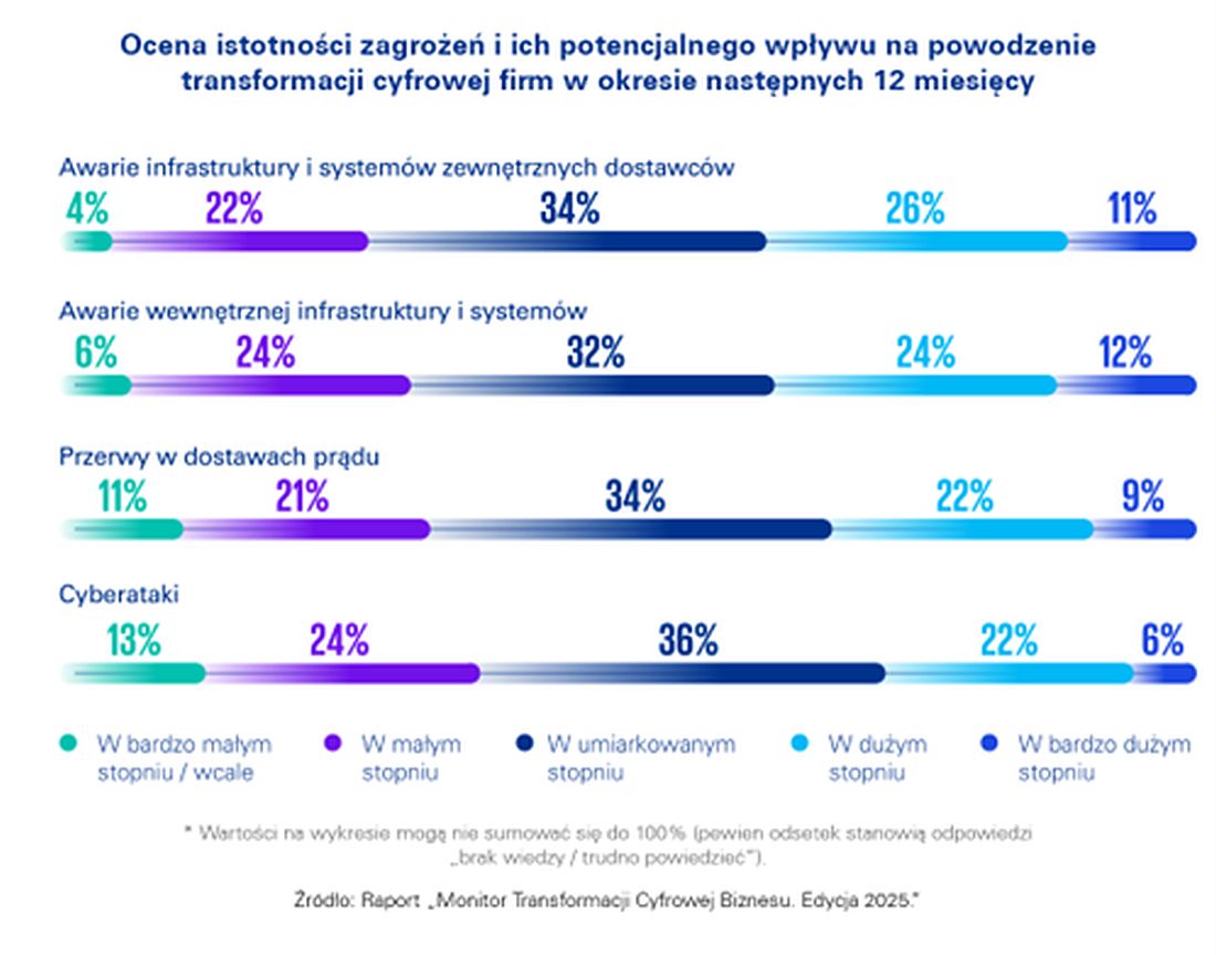 Z perspektywy transformacji cyfrowej organizacje najbardziej obawiają się jednak awarii systemów dostawców zewnętrznych i własnej infrastruktury. Cyberataki, choć znalazły się niżej na liście ryzyk, aż przez 64% firm uznawane są za czynnik o co najmniej umiarkowanym wpływie na biznes, a w przypadku 28%, o dużym lub bardzo dużym.