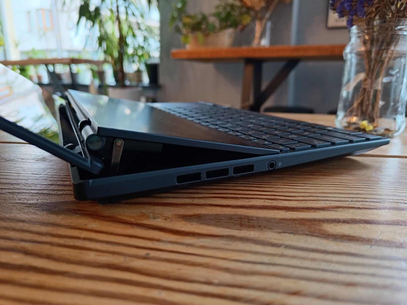 System chłodzenia w ZenBooku Duo Pro sprawdza się dobrze. Świeże powietrze dostaje się do wentylatorów przez otwartą przestrzeń, uzyskaną poprzez uniesienie ScreenPada. Na spodzie znajdują się tylko dodatkowe kratki wentylacyjne nad komponentami. To bardzo przemyślane rozwiązanie, bo zapewnia naprawdę dużą przepustowość powietrza.