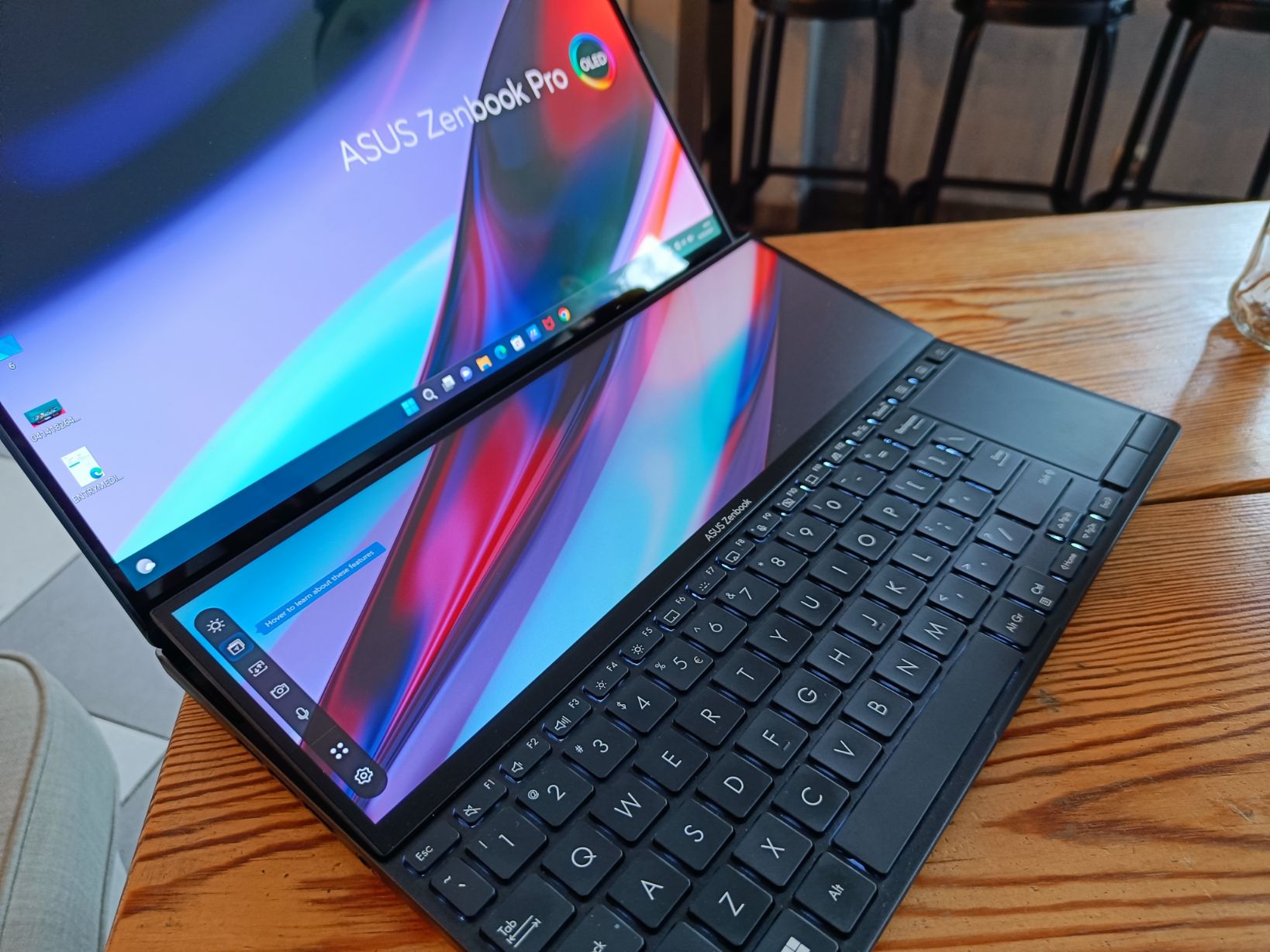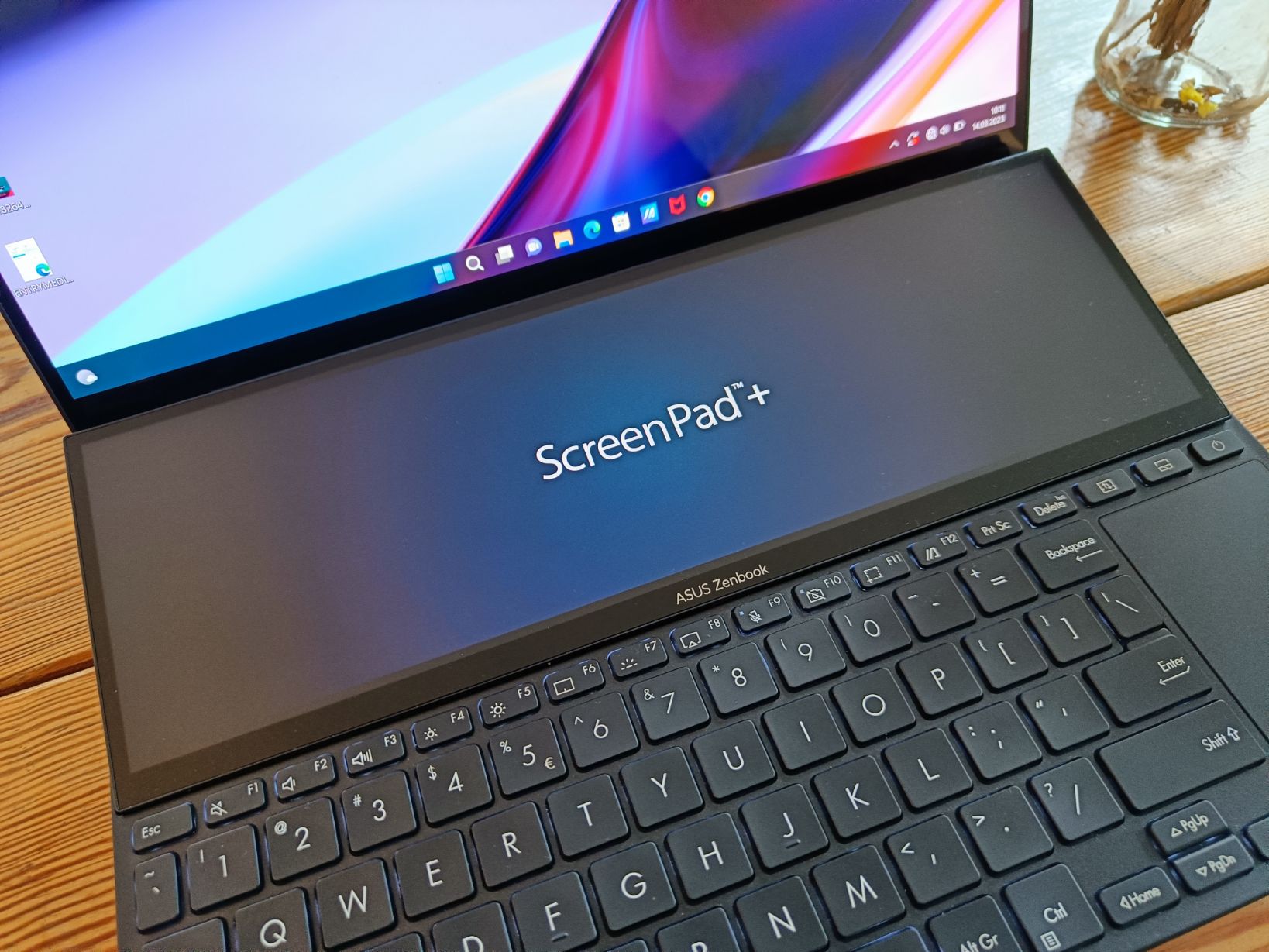 Zacznijmy od przyjrzenia się obydwu ekranom. Większy panel o przekątnej 14,5” to OLED cechuje się wysoką jakością obrazu. Towarzyszy mu drugi ekran, tzw. ScreenPad o przekątnej 12,7” w niecodziennym formacie 32:10. W przeciwieństwie do błyszczącego ekranu głównego, ScreenPad jest matowy. Jego rozdzielczość to 2880 x 864 piksele, a częstotliwość odświeżania to 120 Hz.