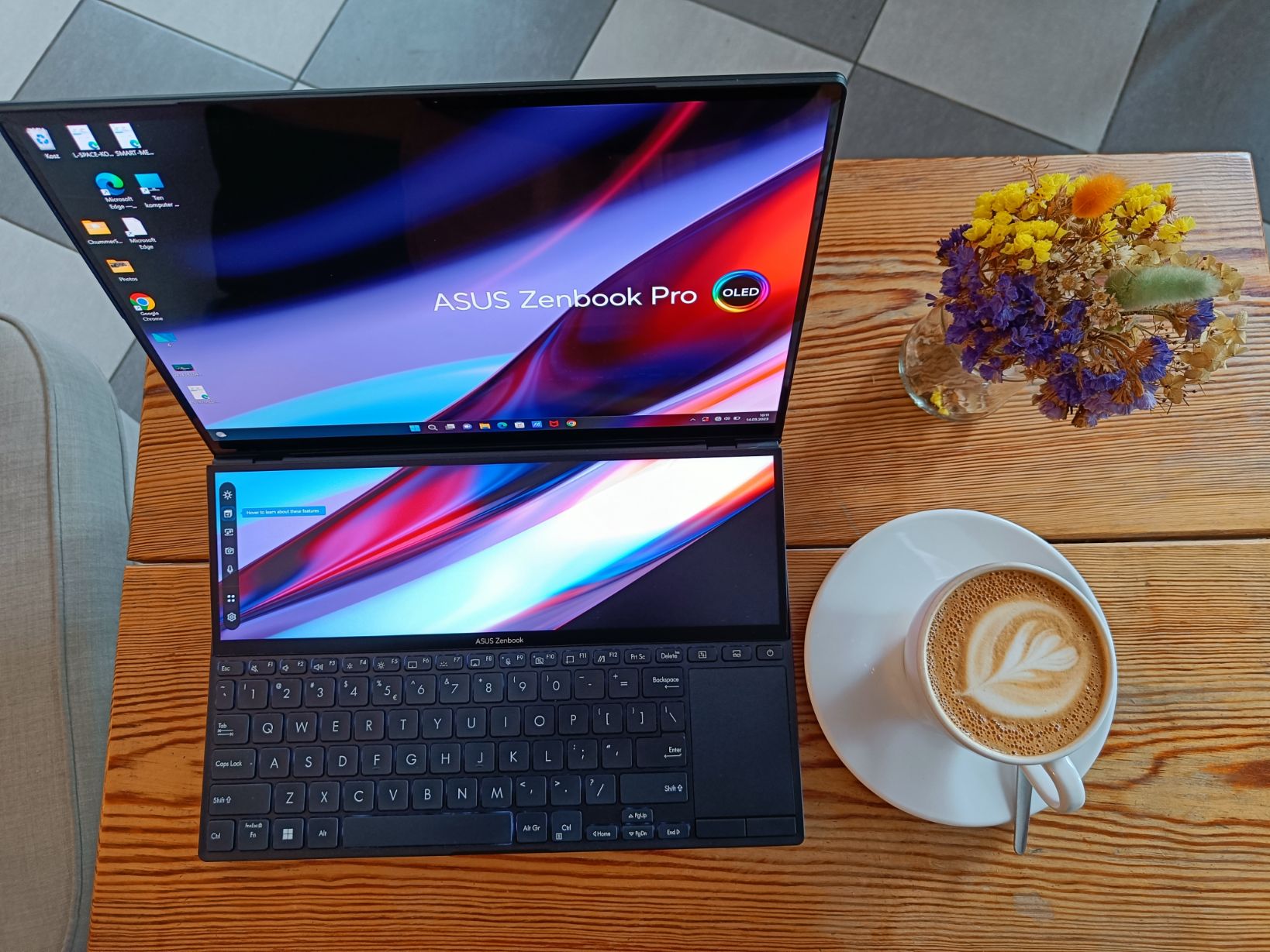 Reasumując moje narzekanie – ten komputer jest… znakomity, przynajmniej tak długo jak pracujemy wyłącznie przy biurku. Wówczas, pod względem ergonomii jest naprawdę dobrze. Obydwa ekrany są czytelne, znakomicie się uzupełniają, do niecodziennego układu z gładzikiem z prawej strony można przywyknąć dość szybko, a pochylony ScreenPad to naprawdę dobry pomysł.