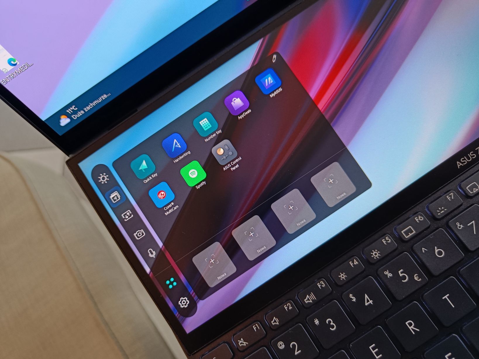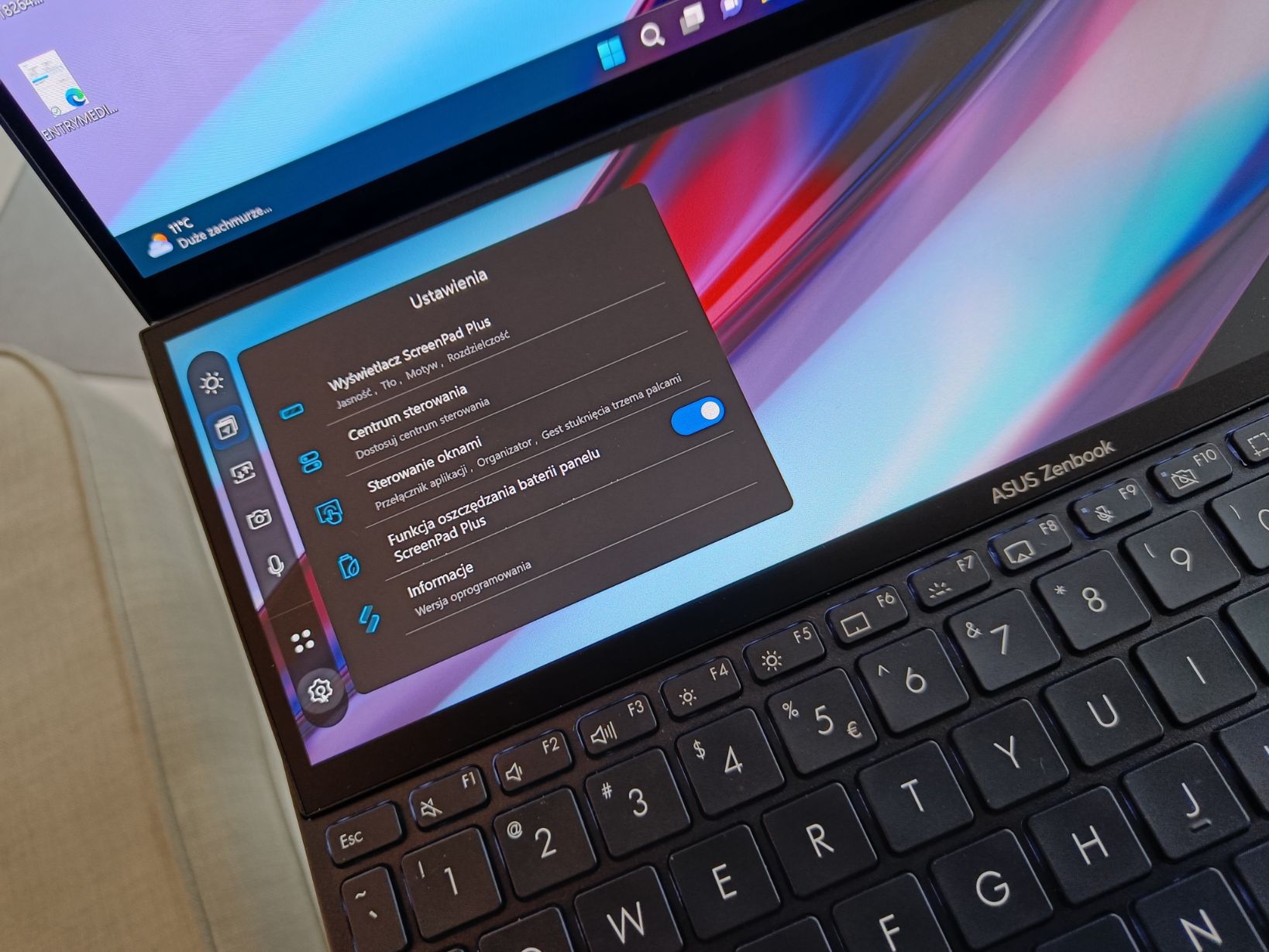 Co to oznacza w praktyce? Ta sama szerokość w pikselach, ta sama częstotliwość odświeżania, co na ekranie głównym sprawiają, że przesuwanie treści między ekranami nie powoduje dziwnych przeskalowań, przynajmniej do momentu aż umieścimy jakąś treść jako pełen ekran na ScreenPad. Wówczas jednak większość aplikacji zachowuje się wciąż normalnie. To ważne, bo zapewniam, że jeśli zakupisz ten komputer, to zaczniesz intensywnie z drugiego ekranu korzystać. Wiem, bo w trakcie testowania tego komputera sam robię to nad wyraz często. W jaki sposób?