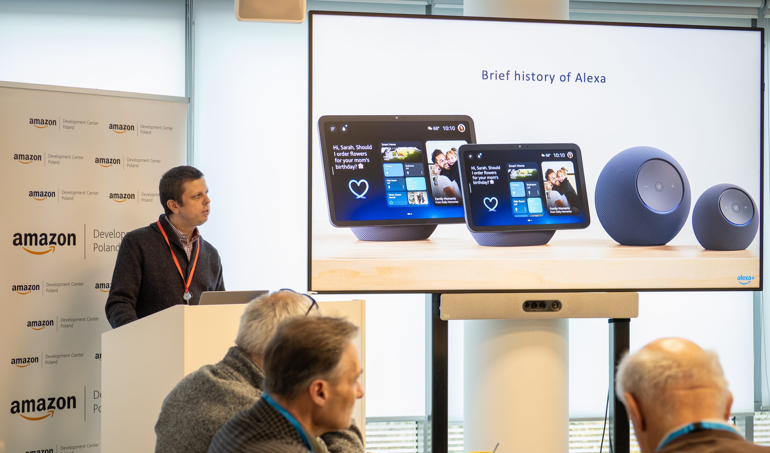 Drugim prelegentem był Maciej Chmielarz, menedżer inżynierii oprogramowania w zespole Amazon Alexa, od 11 lat związany z firmą, jeszcze od czasów pracy w biurze w Gdyni. Przypomniał, że pomysł na Alexę narodził się w 2011 roku, kiedy zainspirowani komputerem ze Star Treka inżynierowie Amazon postanowili zbudować w chmurze system w pełni sterowany głosem – oparty na najbardziej naturalnym interfejsie człowieka, czyli mowie. Postępy w mocy obliczeniowej, dostępności danych i algorytmach przetwarzania dźwięku pozwoliły w 2014 roku wypuścić pierwsze urządzenie Amazon Echo i usługę Alexa, która dziś działa na blisko miliardzie punktów końcowych i kontroluje niezliczoną liczbę elementów inteligentnego domu.