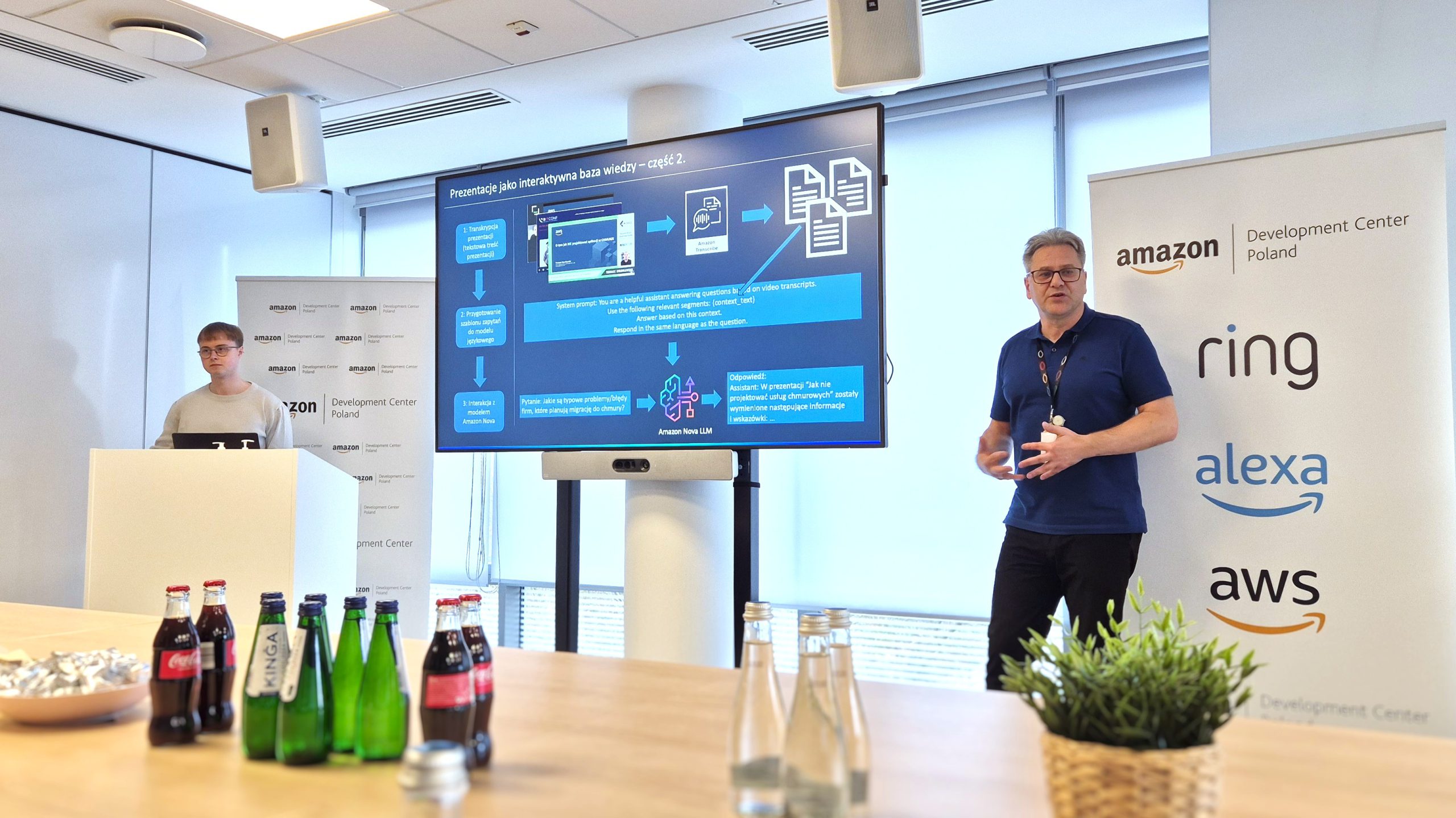 Mariusz Momotko i Jakub Dębski, inżynierowie z zespołu AGI, zaprezentowali praktyczne zastosowanie wspomnianych już “klocków Lego” od AWS. W ciągu kilku godzin stworzyli aplikację, która przekształca prezentacje z YouTube’a w interaktywną bazę wiedzy. Aplikacja działa w trzech krokach: najpierw za pomocą Amazon Transcribe wydobywa tekst z nagrania wideo, następnie formatuje go w sposób zrozumiały dla modeli językowych (tzw. prompt engineering), a na końcu wykorzystuje model Amazon Nova do odpowiadania na pytania użytkownika. Co istotne, Nova jest rozwijana przez zespoły w Gdańsku, które specjalizują się w optymalizacji wydajności modeli – poprawie czasu odpowiedzi i redukcji kosztów.