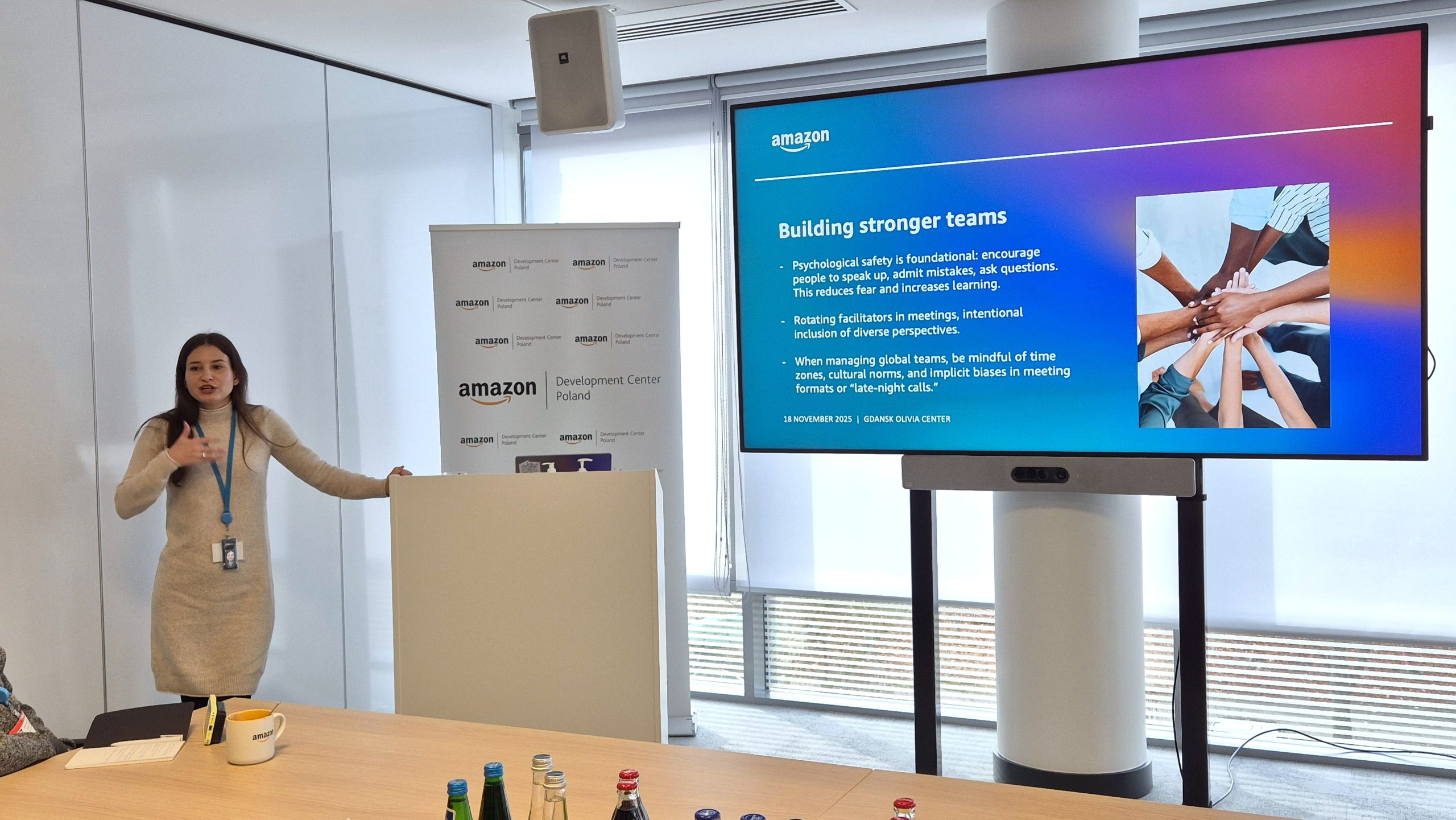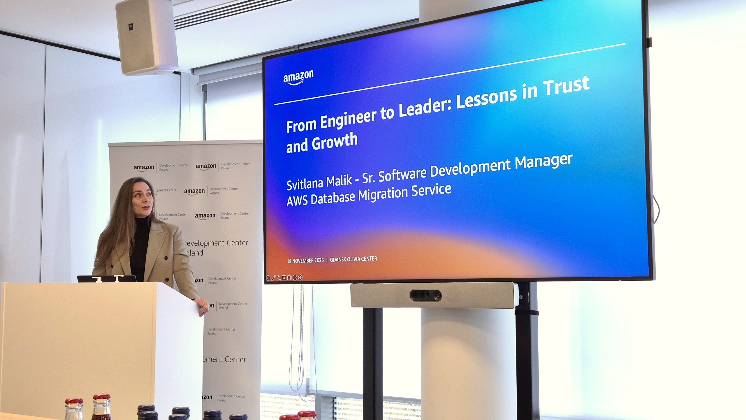 Svitlana Malik, Senior Software Development Manager w AWS i przedstawicielka AWS Database Migration Service w Polsce, podzieliła się z kolei osobistą historią transformacji z inżyniera w lidera. “Gdy pisałam pierwszy wiersz kodu 12 lat temu, nie wyobrażałam sobie, że moje największe wyzwanie będzie dotyczyło ludzi, a nie programowania” – rozpoczęła. Opisała, jak w poprzedniej firmie próbowała zarządzać zespołem tak, jak pisała kod – optymalizując każdy proces i kontrolując każdy szczegół techniczny. “Gdy dołączyłam do Amazon cztery lata temu, wszystko się zmieniło. Skala jest tu zupełnie inna, każda decyzja wymaga współpracy wielu zespołów. Jeśli lider bierze wszystko na siebie, tylko wszystkich zwalnia”.
